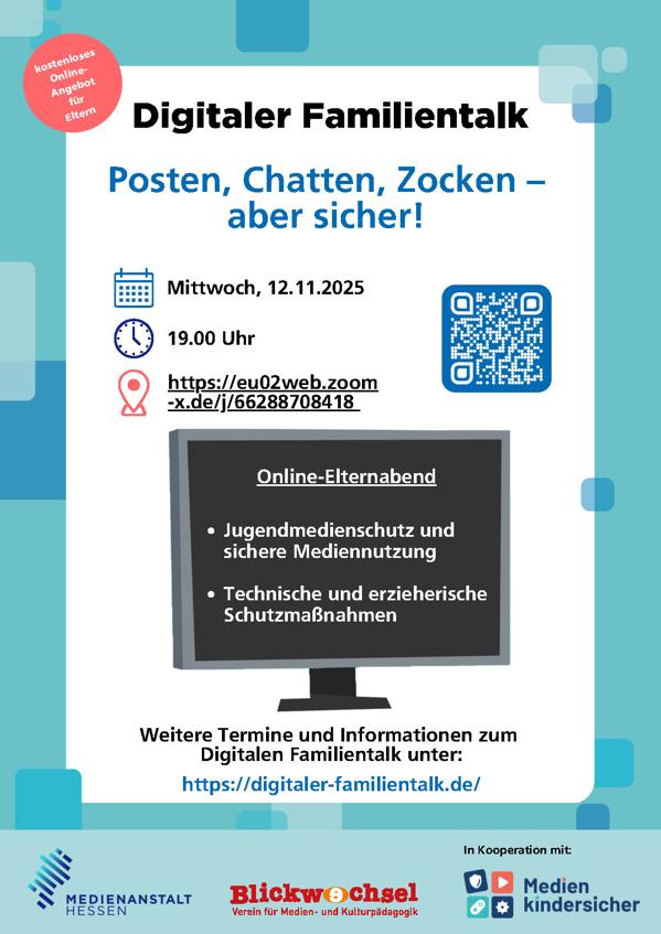 Anbei finden Sie ein Plakat zum kommenden Digitalen Familientalk am 12. November 2025, 19.00 Uhr. Thema: Posten, Chatten, Zocken – aber sicher! In Kooperation mit medien-kindersicher.de, dem Portal zum technischen Jugendmedienschutz.