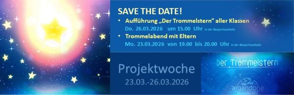 Am Donnerstag, den 26.03.2026 präsentieren die Schülerinnen und Schüler die Trommelgeschichte „Der Trommelstern“ in einer Aufführung um 15.00 Uhr in der Bürgerhaushalle. Einlass ist ab 14.30 Uhr.