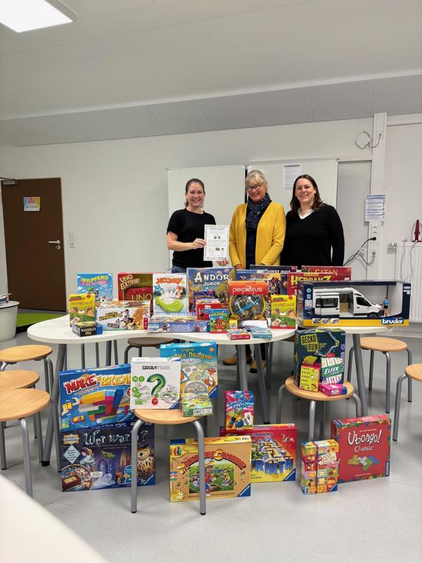 Am 23. Oktober 2025 war es soweit, das Spielepaket wurde von Frau Ostner vom Kaufhaus Enders an die Gundernhäuser Schule übergeben. Derzeit besuchen 135 Kinder das Angebot „Pakt für den Ganztag“ der Gundernhäuser Schule und freuen sich riesig über die vielen neuen Spiele.